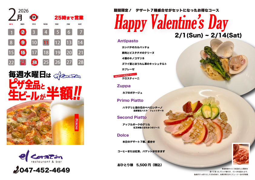 フェリーチェ (幸せ)という名のコース料理。 旬の食材を生かした、エルコラソン・スペシャルディナーをお楽しみください。【写真はコースの一例です】 2025年11月フェリーチェコース Antipasto 鮮魚のカルパッチョ […]